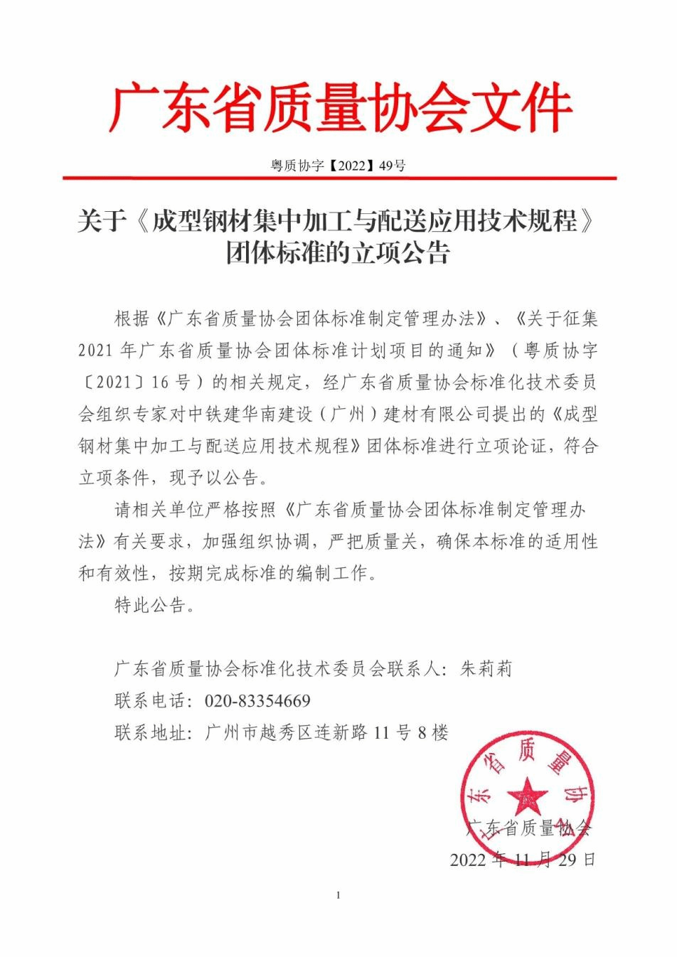《成型钢材集中加工与配送应用技术规程》是由中铁建华南建设(广州)建材有限公司提出,广东省质量协会同意立项的全省性团体标准。该标准由中铁建华南建设(广州)建材有限公司主导,广东省粤科标准化研究院和伟德国际victor1946提供技术支持,联合中铁建华南建设有限公司、中铁十一局集团有限公司、中铁建华南建设(广州)高科技产业有限公司等企事业单位联合起草。严格按照国家标准委和民政部发布的《团体标准管理规定》相关程序开展标准的制定工作,该标准将在全国团体标准信息平台公开发布,并移送中国标准出版社申请出版和全国发行。