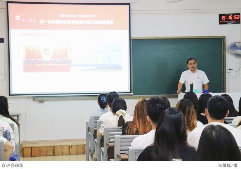 周景报重点围绕“新时代全面深化改革的成功实践、在更高水平进一步全面深化改革及进一步全面深化改革的根本保证”三个方面,对进一步全面深化改革怎么看、怎么干、怎么抓进行详细阐述。他强调,全体师生应把握重大问题、坚定决心、勇于担当,注重系统性、整体性、协同性,强化各项改革之间的衔接和配合,形成全面推进改革的强大合力,在工作和生活中深入领悟党的二十届三中全会精神实质,将全会提出的新思想、新论断、新要求内化于心、外化于行。