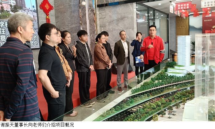 活动中,谢振天董事长详细介绍了公司的发展历程、中房美苑项目的整体规划、建设进展与核心亮点,并带领教师团队实地参观了项目展厅与项目现场。在展厅内,老师们仔细端详栏杆、PVC管、窗户等材料样板,反复比对差异;在谢董的热情邀请下,老师们还亲手敲击钢筋混凝土楼板,从声音和质感中直观感受优质与劣质建材的显著区别,从而深入理解了施工用料的严苛标准与工艺细节;在项目现场,大家观摩了施工流程、安全管理规范及新型技术应用情况,并就智慧医院与住宅融合的创新理念及新型物业管理模式进行了交流。