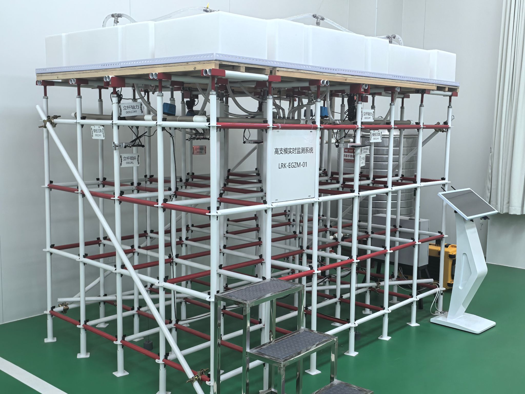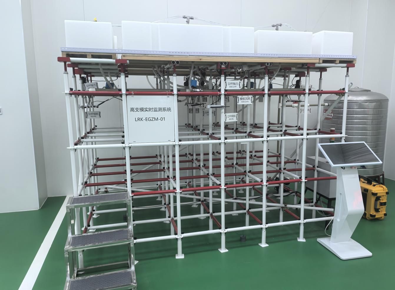 高支模监测系统 LRK-EGZM-01 整体上由三部分构成:1.由等比缩放管件组成的高支模模型;2.由水路循环系统及控制组件构成的模拟浇筑系统;3.由监测设备与传感器组合监测的监测系统;(现场实际使用的真实设备,包含监测软件)。三部分共同组成高支模监测系统LRK-EGZM-01,可实现对高支模模架组成的整体讲解,浇筑过程的整体模拟,施压泄压过程中的各项数据实时监测。