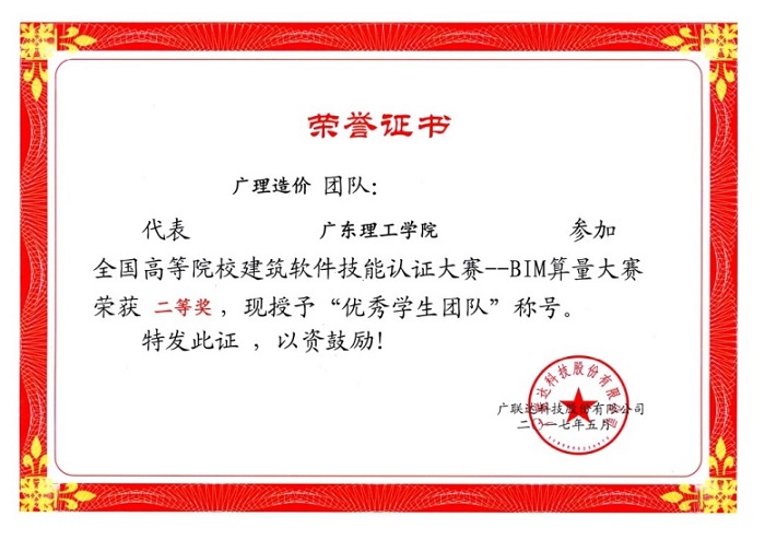 校内表彰2017年全国高等院校建筑软件技能认证大赛——BIM算量大赛二等奖